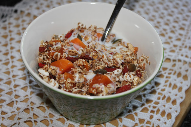 Gosto de variar o pequeno almoço mas um dos meus preferidos é fruta fresca partida em bocadinhos (desta vez foi dióspiro), iogurte natural, cereais tufados (centeio, espelta e amaranto) e a minha granola que está publicada no post de dia 26 de junho de 2013.